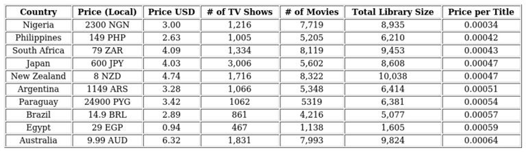 - Nigeria: monthly fee $3.00, 8,935 titles, cost per title ≈ $0.00034.