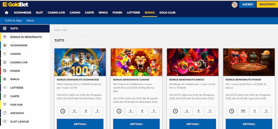 Le promozioni sono uno degli aspetti che attirano di più i nuovi giocatori. Goldbet propone bonus di benvenuto molto competitivi, ma anche offerte continue per i clienti già registrati.