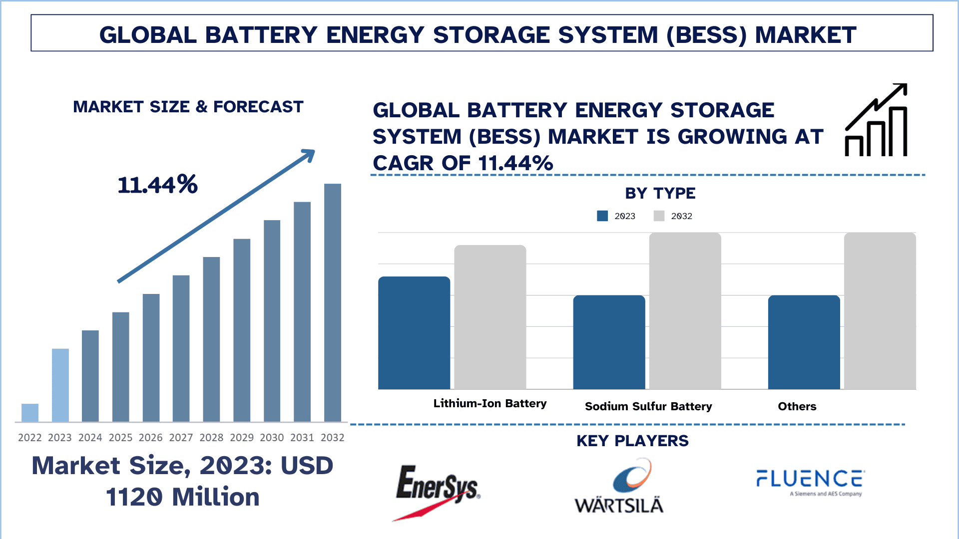 According to the Univdatos analysis, growing investments in Battery Energy Storage System (BESS) for assisting power sector expansion, the sector will surge in demand for the Global Battery Energy Storage System (BESS) Market, which will drive the global scenario of the “Global Battery Energy Storage System (BESS)” report; the global market was valued at USD 1120 million in 2023, growing at a CAGR of 11.44% during the forecast period from 2024 – 2032.