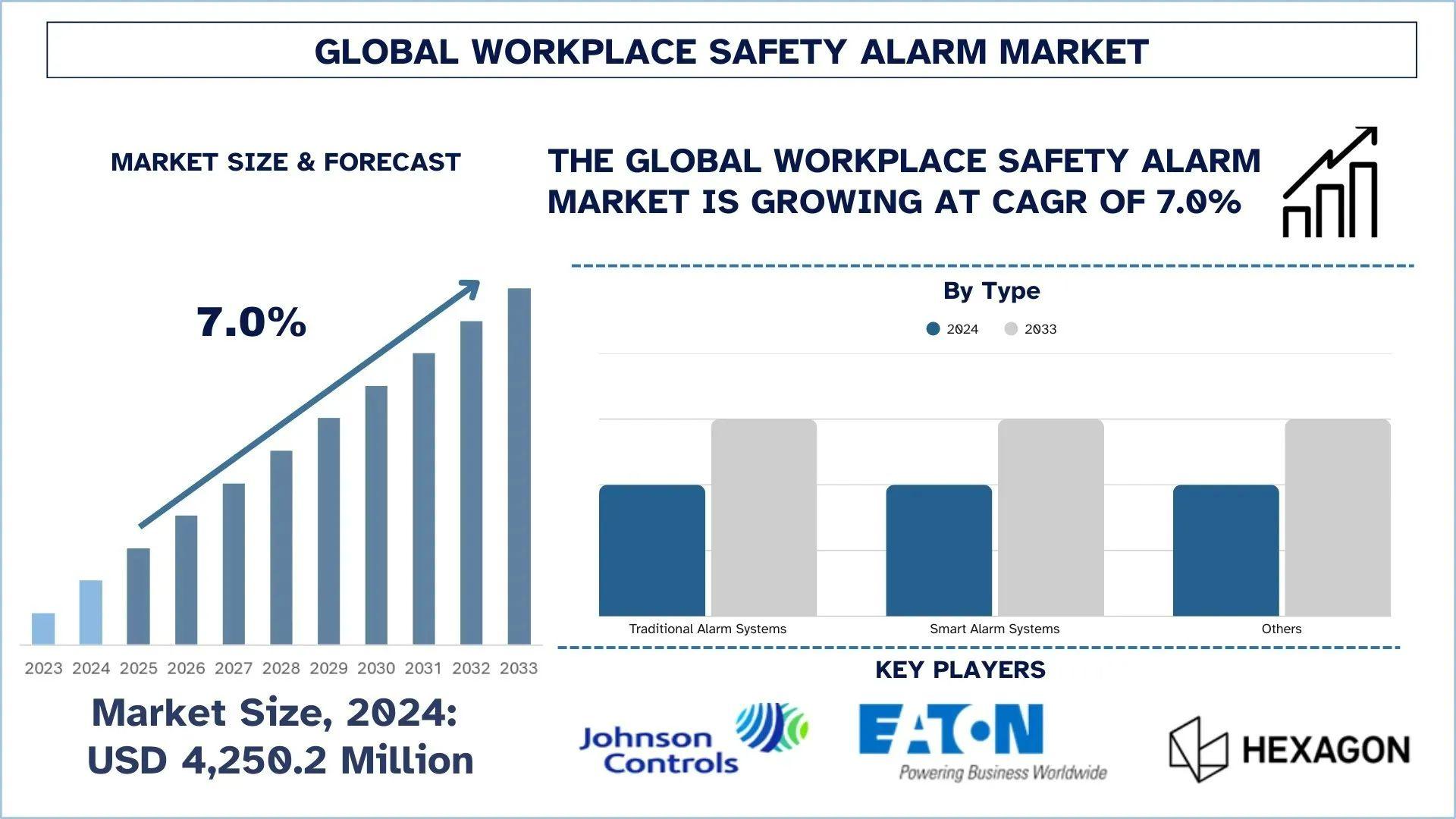 According to UnivDatos analysis, rising technological advancements and rigid regulatory compliance, coupled with continuous investment and mergers & acquisitions, are the major factors driving the growth of the Workplace safety alarm market. As per their “Workplace Safety Alarm Market” report, the global market was valued at USD 4,250.2 million in 2024, growing at a CAGR of about 7.0% during the forecast period from 2025 - 2033 to reach USD million by 2033.