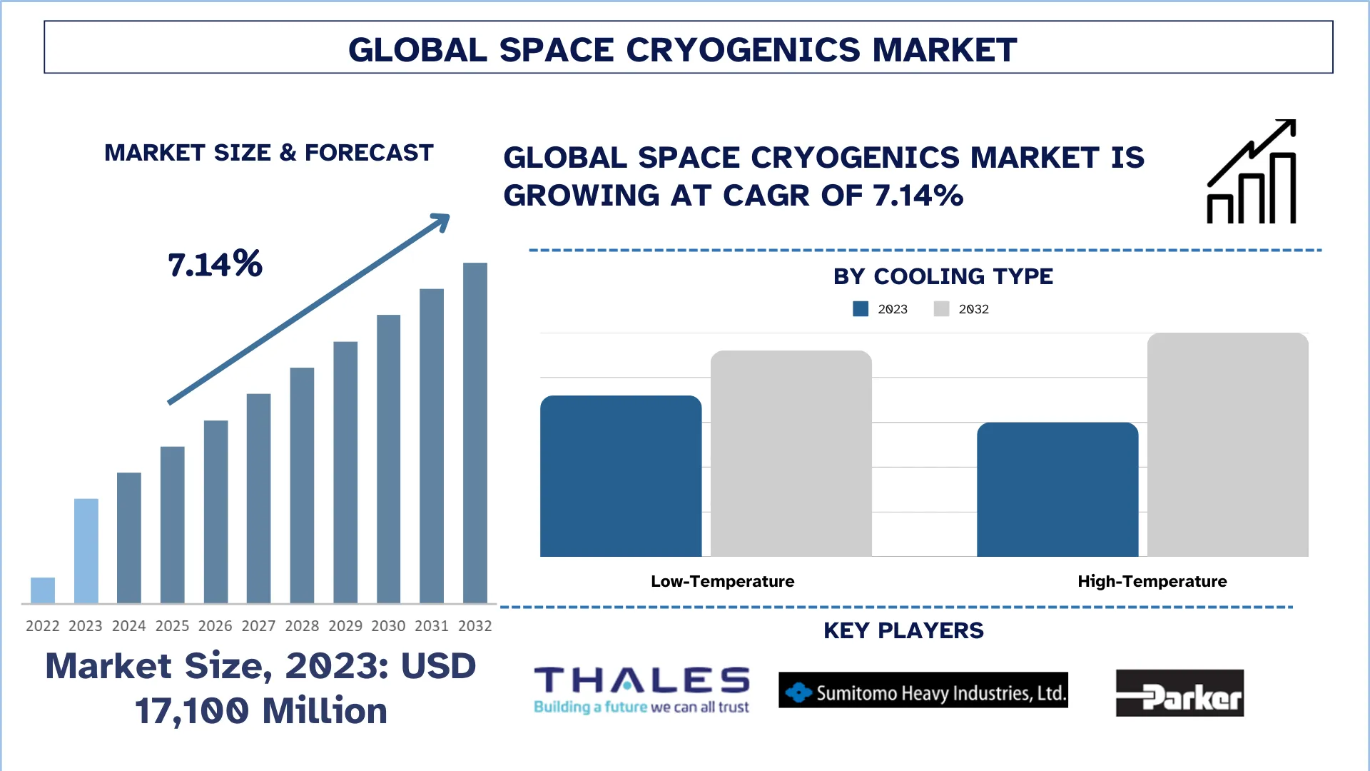 According to the Univdatos analysis, growing investments in Space Cryogenics for effectively conducting space missions and satellite launches will drive the global scenario of the “Global Space Cryogenics Market” report; the global market was valued at USD 17,100 million in 2023, growing at a CAGR of 7.14% during the forecast period from 2024 – 2032.