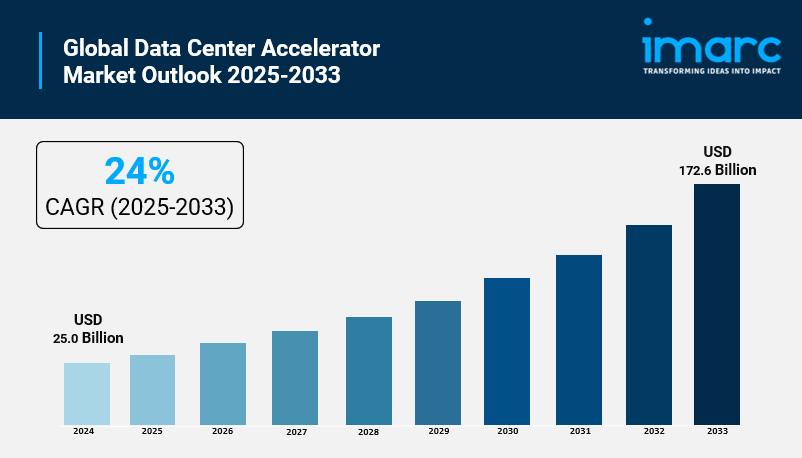 The global data center accelerator market size reached USD 25.0 Billion in 2024 and is projected to reach USD 172.6 Billion by 2033, representing a CAGR of 24% during the forecast period 2025-2033. Data center accelerators enhance computational capabilities, improve power efficiency, and accelerate workloads such as deep learning, machine learning, and high-performance computing. The market growth is driven by rising demand for network bandwidth and advanced analytics with rapid and optimal performance.