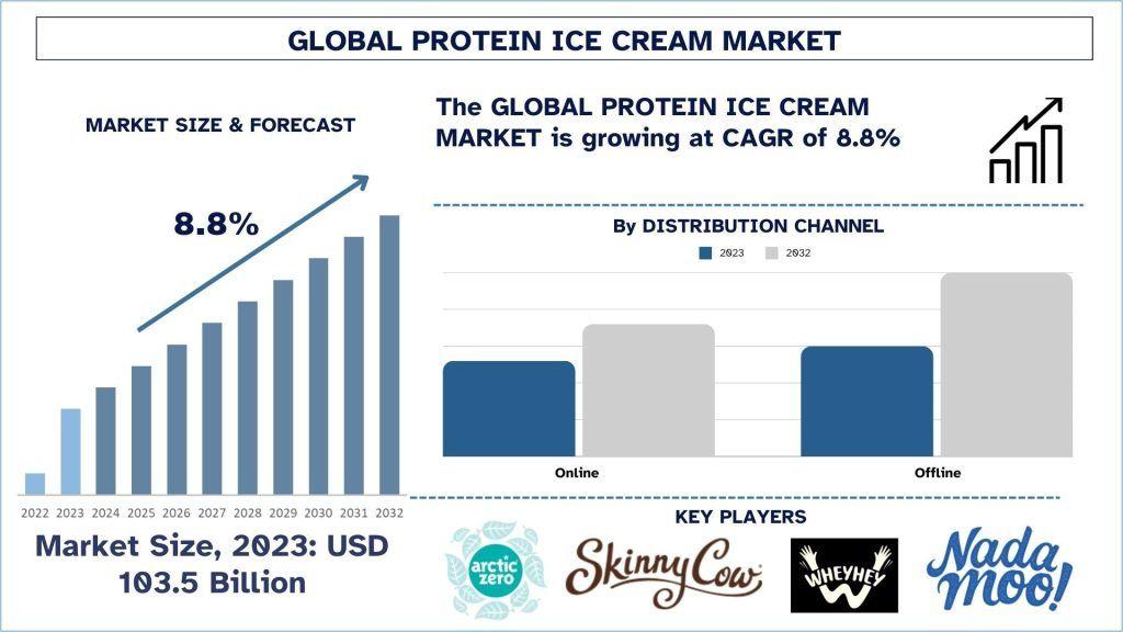 According to the UnivDatos, rising health & wellness trends, and continuous innovation in flavors, textures, and formulations across the globe will drive the global scenario of the protein ice cream market. As per their “Protein Ice Cream Market” report, the global Market was valued at ~USD 103.5 billion in 2023, growing at a CAGR of about 8.8% during the forecast period from 2024-2032 to reach USD billion by 2032.