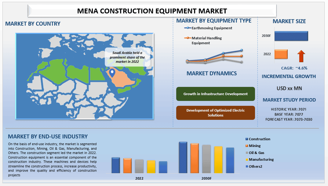 According to the UnivDatos, the increasing infrastructure development, urbanization, and government initiatives will drive the global scenario of the construction equipment market and as per their “MENA Construction Equipment Market” report, the Market was valued at USD million in 2022, growing at a CAGR of 4.6% during the forecast period from 2023 - 2030 to reach USD billion by 2030.