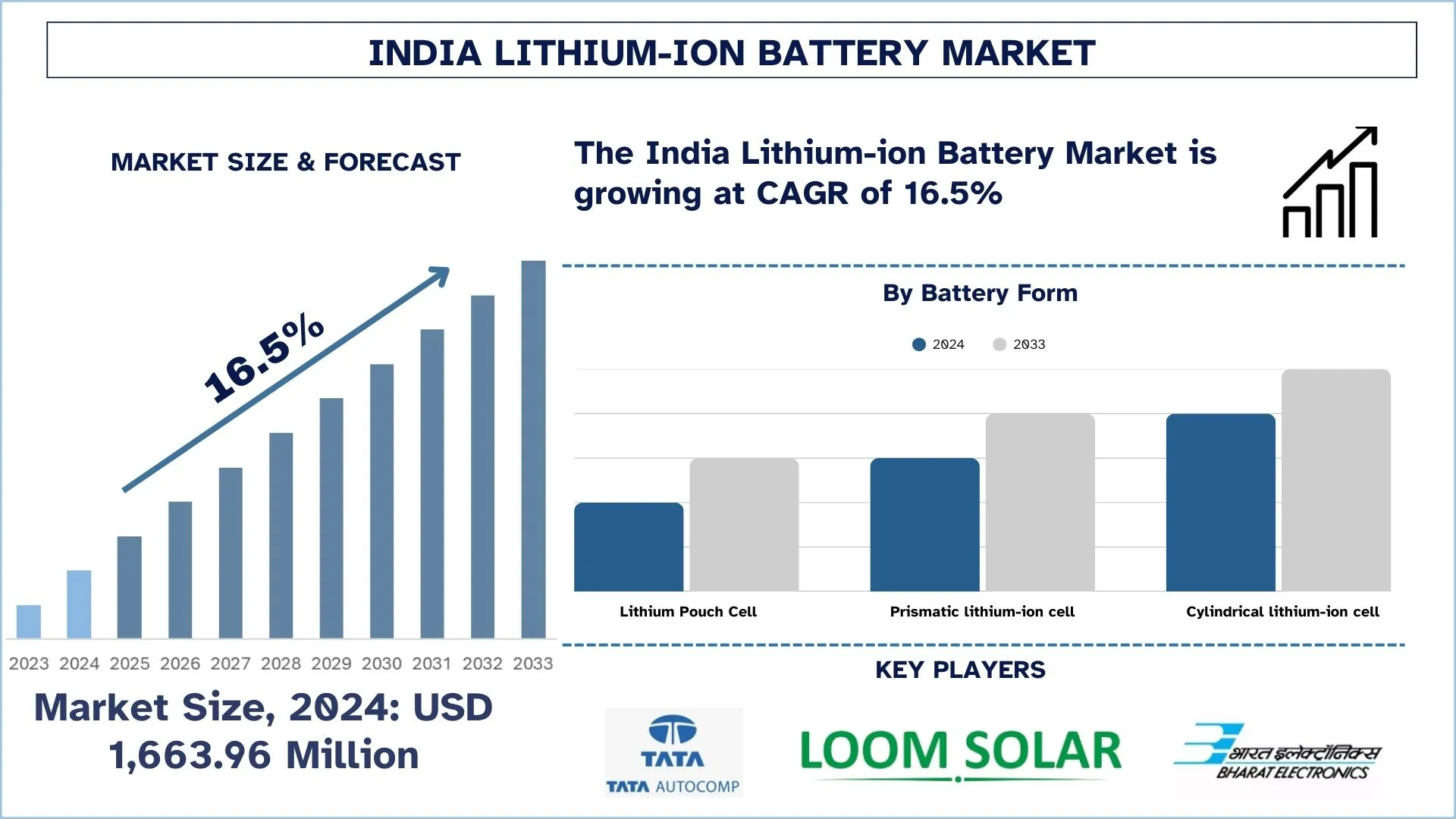 The India Lithium-ion Battery market has several major players, including Tata AutoComp Systems Ltd, LOOM SOLAR PVT. LTD., SAMSUNG SDI CO., LTD., Bharat Electronics Limited (BEL), and Panasonic Industry Co., Ltd. More information about these companies has been provided below: