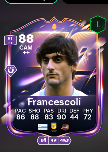 Enzo Francescoli’s Heroes card features him as a Central Attacking Midfielder with an impressive overall rating of 88, showcasing a dynamic blend of attributes that make him a standout choice in this pivotal role. With 86 pace and 90 dribbling, Francescoli brings swift movement and exceptional ball control to the midfield, while his 88 shooting and 83 passing ensure he can both create and finish scoring opportunities. Although his defense rating is lower at 44, his 72 physicality provides enough resilience to hold his ground against opponents. As a central attacking midfielder, Francescoli excels at orchestrating play and breaking down defenses, offering the creativity and attacking threat needed to unlock tight matches and secure crucial goals for your team.