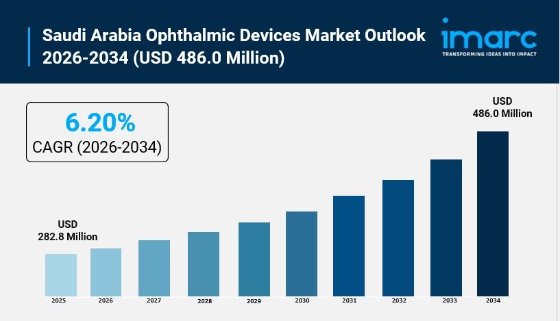 According to IMARC Group's latest research publication, "Saudi Arabia Ophthalmic Devices Market: Industry Trends, Share, Size, Growth, Opportunity and Forecast 2026-2034", The Saudi Arabia ophthalmic devices market size was valued at USD 282.8 Million in 2025. Looking forward, IMARC Group estimates the market to reach USD 486.0 Million by 2034, exhibiting a CAGR of 6.20% during 2026-2034.