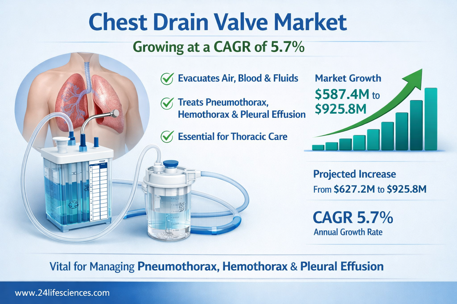According to a newly published market research report by 24LifeSciences, global chest drain valve market was valued at USD 587.4 million in 2024 and is projected to grow from USD 627.2 million in 2025 to USD 925.8 million by 2032, expanding at a compound annual growth rate (CAGR) of 5.7% during the forecast period 2025–2032.