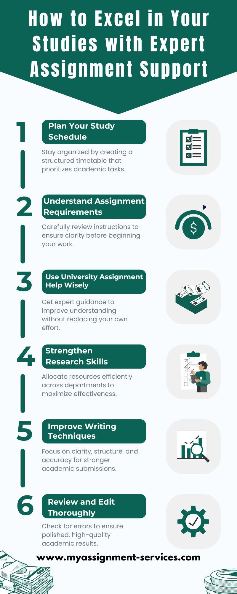 Achieving academic success becomes easier when you follow the right strategies and use reliable educational resources. This infographic highlights essential tips for managing deadlines, improving research skills, and enhancing writing quality. With trusted university assignment help in the mix, students can better understand complex topics, stay organized, and produce well-structured work. Explore how expert guidance, smart planning, and effective study habits can boost your performance and confidence throughout your academic journey.