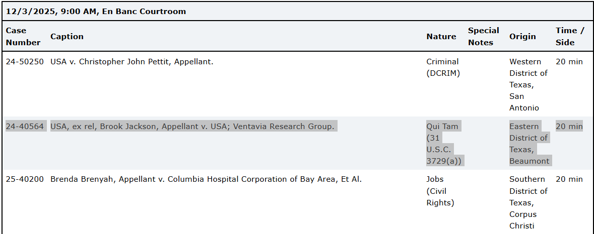 • Pfizer Lawsuit Update: USA, ex rel. Brook Jackson v. USA; Ventavia; Pfizer—is officially scheduled for oral argument on December 3, 2025 at 9:00 AM in the Fifth Circuit’s En Banc Courtroom.