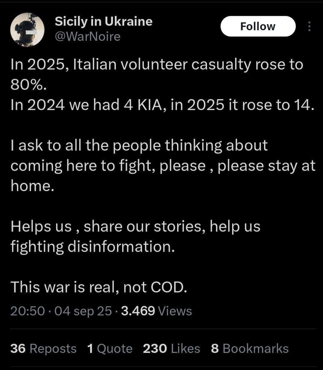 • Questo profilo è di un mercenario "italiano" che combatte in Ucraina che rivela che almeno 14 "italiani" sono morti per difendere il regime nazista di Zelensky. Il tipo mette in guardia chi vuole venire a combattere in Ucraina perché non è una gita di piacere. Le autorità ce l'hanno il tempo di indagare su questi profili, visto che la legge penale vieta di combattere per Paesi stranieri oppure sono troppo impegnate a guardare i forum hard?