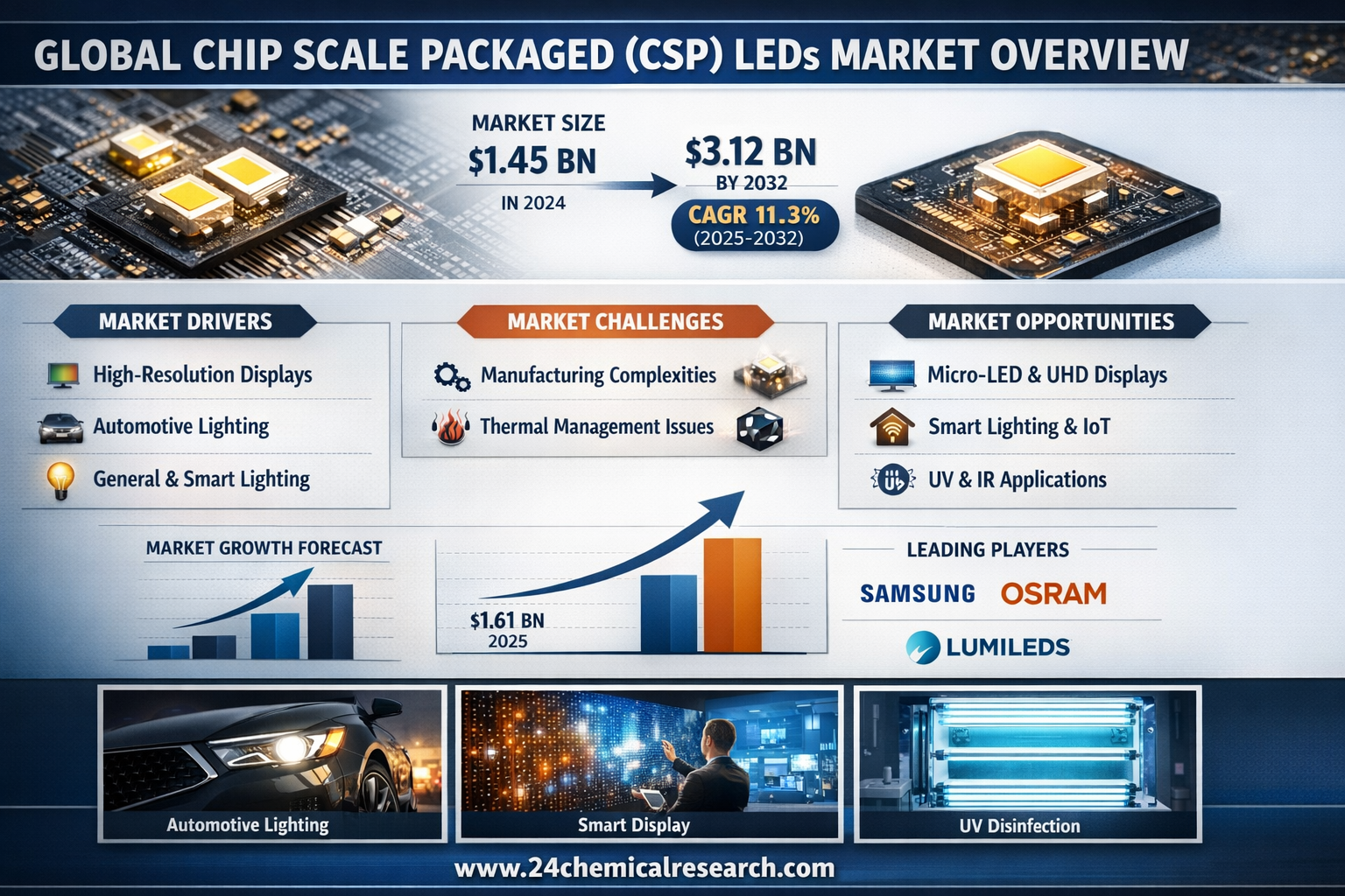 Global Chip Scale Packaged (CSP) LEDs market size was valued at USD 1.45 billion in 2024. The market is projected to grow from USD 1.61 billion in 2025 to USD 3.12 billion by 2032, exhibiting a CAGR of 11.3% during the forecast period.