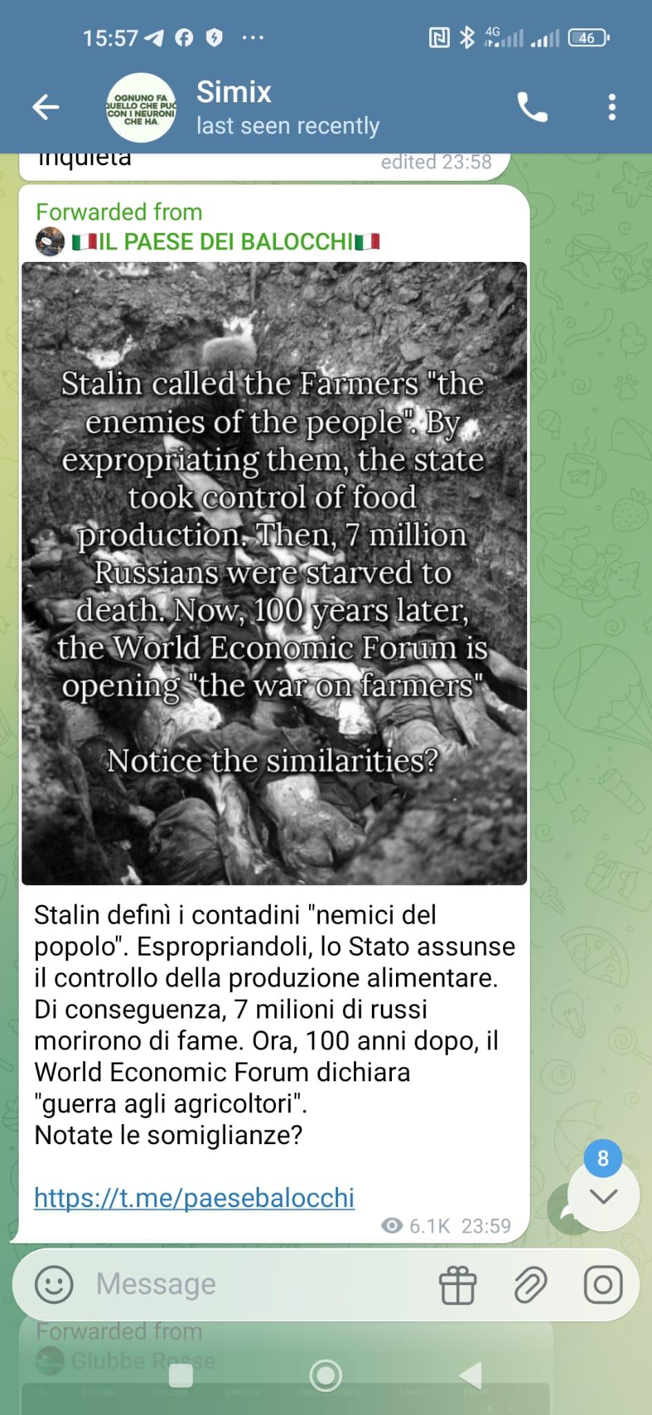 Stalin called the Farmers "the enemies of the people". By expropriating them, the state took control of food production. Then, 7 million Russians were starved to death. Now, 100 years later, the World Economic Forum is opening "the war on farmers". Notice the similarities? Stalin definì i contadini "nemici del popolo". Espropriandoli, lo Stato assunse il controllo della produzione alimentare. Di conseguenza, 7 milioni di russi morirono di fame. Ora, 100 anni dopo, il World Economic Forum dichiara "guerra agli agricoltori". Notate le somiglianze?