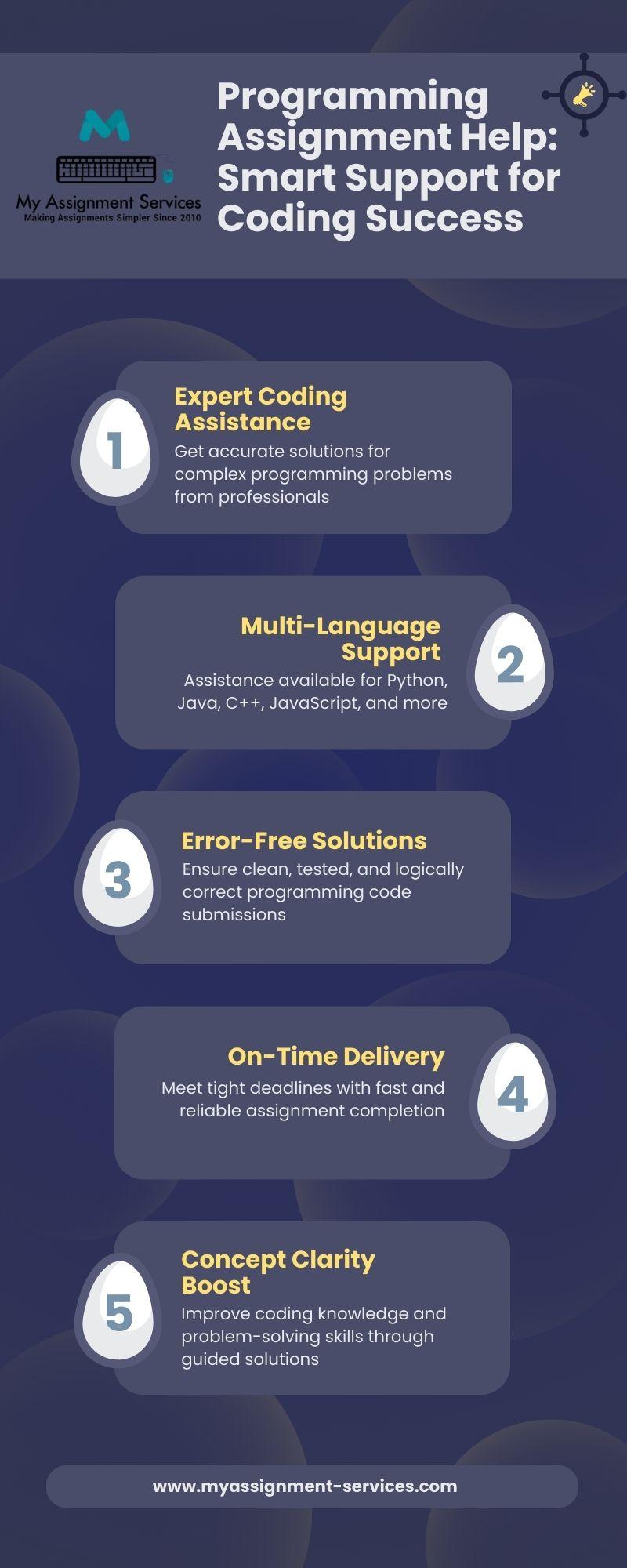 Programming assignments often involve complex logic, multiple languages, and tight deadlines, which can overwhelm students at any academic level. This infographic explains how programming assignment help simplifies coding concepts, improves problem-solving skills, and ensures accurate, error-free solutions. It highlights expert guidance, timely support, and structured learning that help students reduce stress, strengthen technical understanding, and achieve better academic performance with confidence.