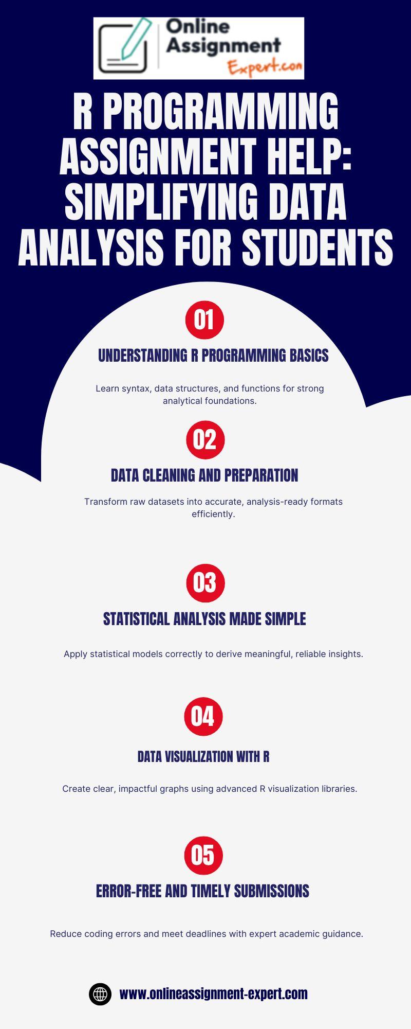 R programming assignment help supports students struggling with data analysis, statistical modeling, and visualization tasks. From handling complex datasets to writing efficient R scripts, expert guidance helps improve accuracy and understanding. This infographic highlights how professional support makes R programming assignments easier, reduces errors, and helps students meet deadlines while building strong analytical and coding skills essential for academic and career success.