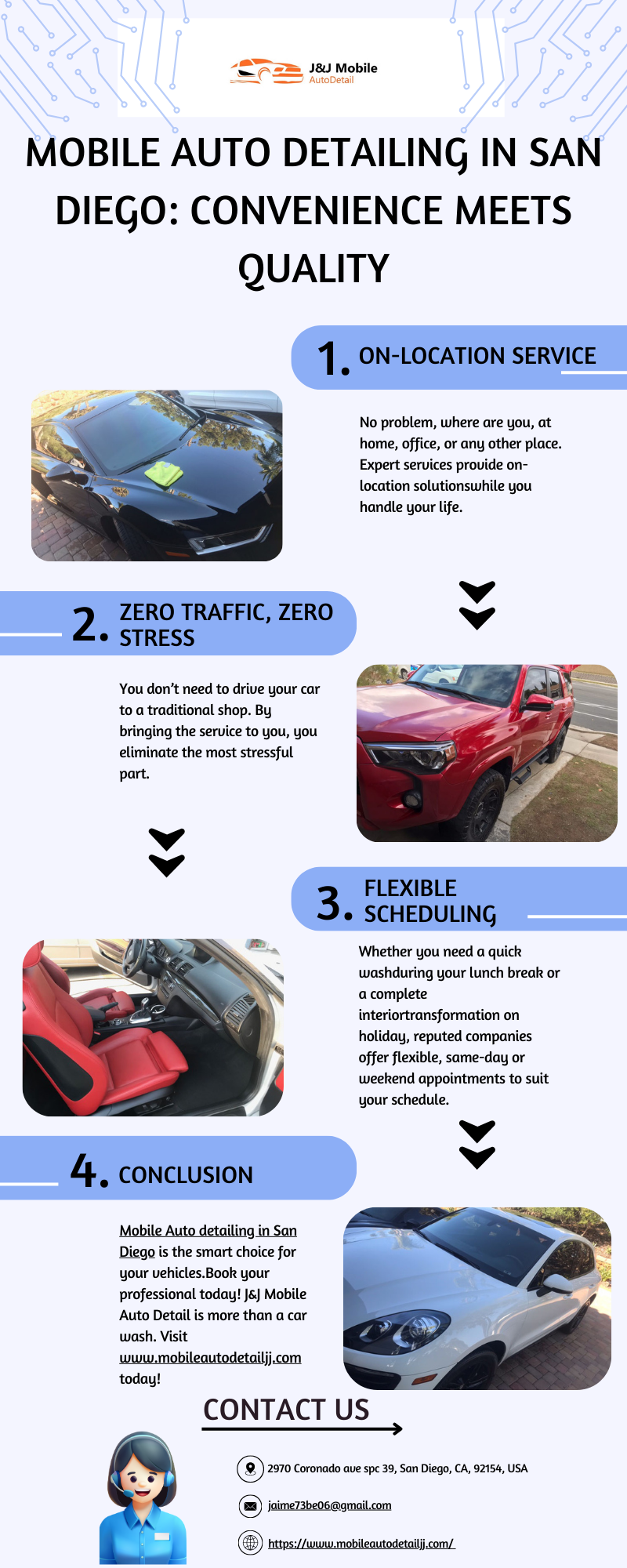 • J&J Mobile Auto Detail aims to provide professional car wash service to your vehicle. We are experts in providing different cleaning services and car wash, interior detail, exterior detail, and complete detailing, etc. We are ready to offer all our services throughout San Diego County and deliver exceptional Customer Service to exceed your expectations. For more details visit our website: https://www.mobileautodetailjj.com/